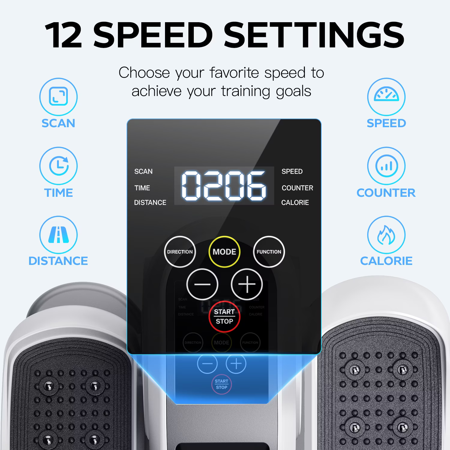 - Forward & Backward: More targeted exercising the front & back of ankle and thigh muscles to boost circulation. The LCD monitor tracks time, diatance, counts and calories burned in real-time. and comes with a remote control to control the machine, allowing you to adjust it without bending over. It is perfect for the elderly and people with limited mobility. Please do not standing up use the elliptical machine