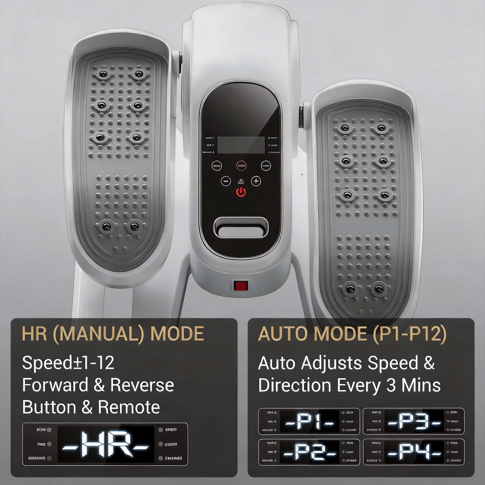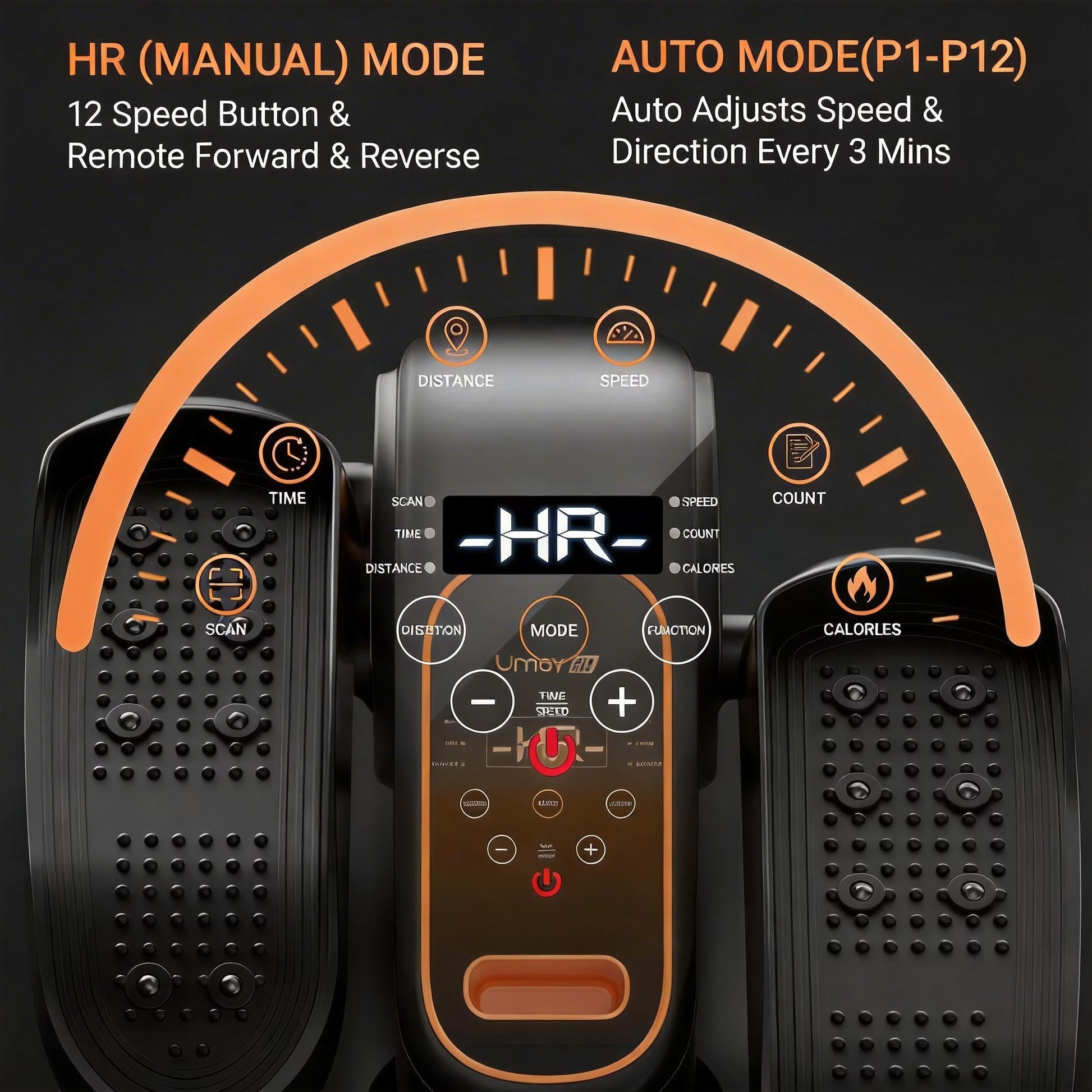 - Auto & Manual Modes: UWill elliptical provides Auto & Manual Modes for you, elderly people can choose 1-4 levels of low speed for leg exercise and relaxation. In Manual mode, you can set workout time of 15-30min, 12 speeds and forward&backward direction by remote control or button of the elliptical machine. The speed and direction have been programmed in Auto mode, you can adjust P1-P12 mode by press mode button, the speed changes every minute and the direction changes every 3 minutes